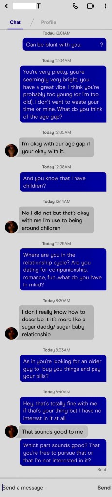 I pointed out the age gap very directly and highlighted the fact that I have kids. Neither of these things seemed to deter her. At this point I was starting to have my suspicions, obviously. She’s either looking for something very casual, has daddy issues, or wants a daddy, a sugary one (not that these things are mutually exclusive).