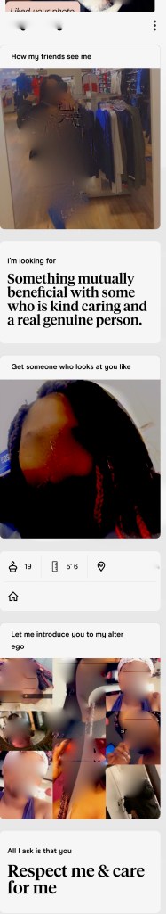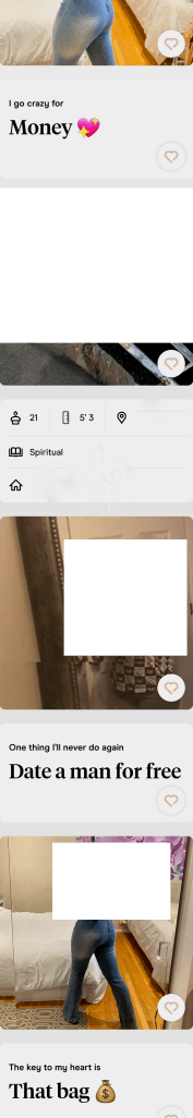 To be clear from the outset, I do not initiate the “like” or swipe on any woman’s profile that seems to be either obviously or probably seeking a Sugar Daddy arrangement. The examples below are shown from being on the receiving end of somebody’s “like”. Both of these happen to be from Hinge but I’ve seen this elsewhere too.